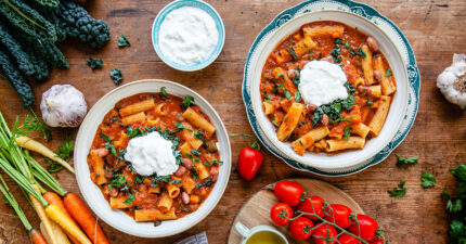 En riktigt smakrik pasta där allt tillagas i samma gryta och toppas med krämig Stracciatella.