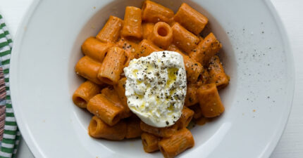 Smakrik vodkapasta toppad med krämig Burrata. Pasta när den är som bäst.